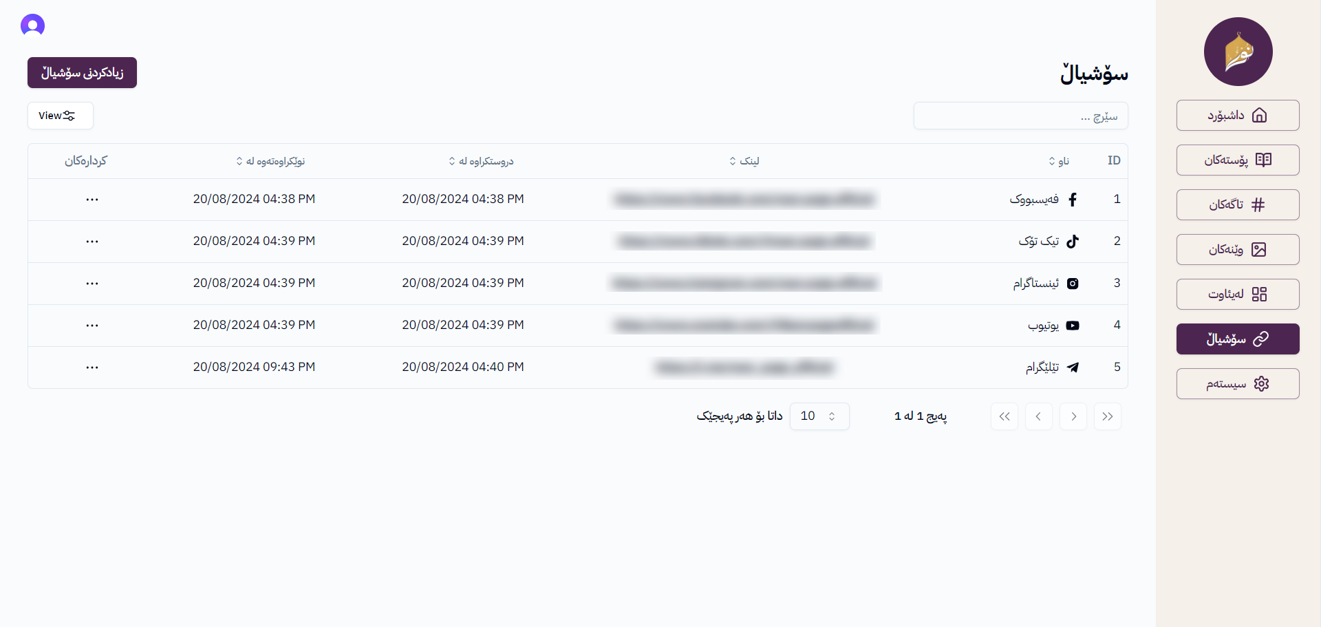Admin Social Links Page