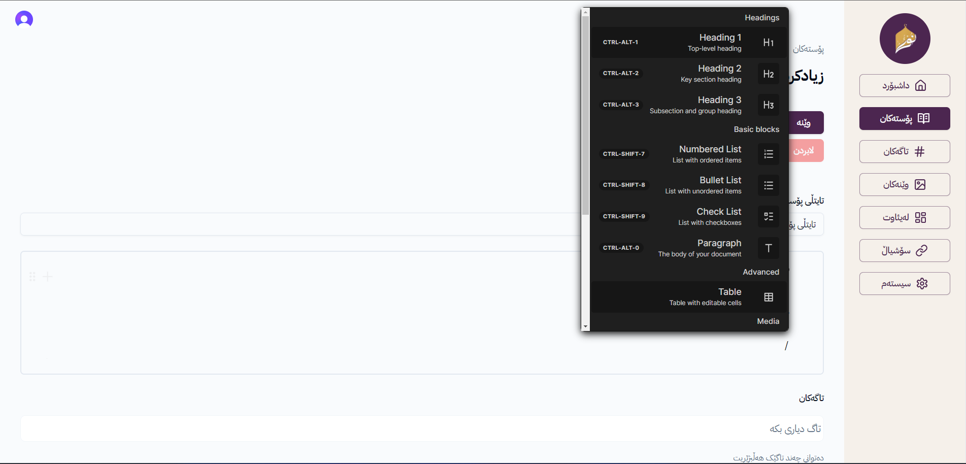 Admin can add new posts, select image, tags and writing the post description by advanced text editor.